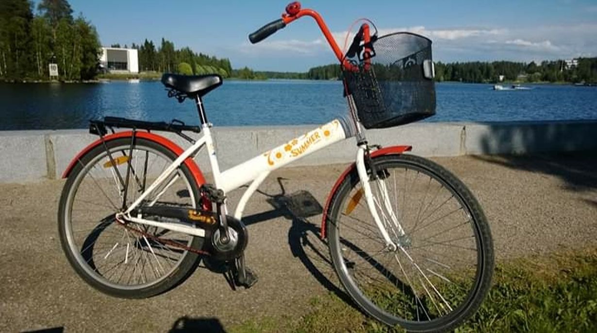 Tässä on Sanelma, jonka sain edesmenneeltä avopulisolta ja ystäviltäni 30-vuotislahjaksi. Hyvä pyörä ajaa ja coolit oranssit kettingit. Tuninkiakin on, Pariisista ostettu leppäkertun mallinen kilikello.