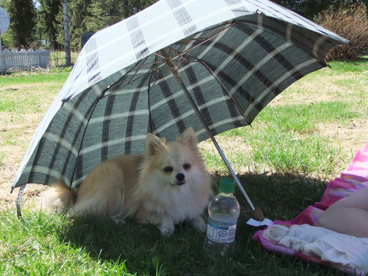 Ostin miehelleni syntymäpäivälahjaksi -86 sateenvarjon, joka on vuosien varrella palvellut meidän koko perhettä. Nyt haurastunut sateenvarjo jatkaa "elämäänsä" koiramme aurinkosuojana.