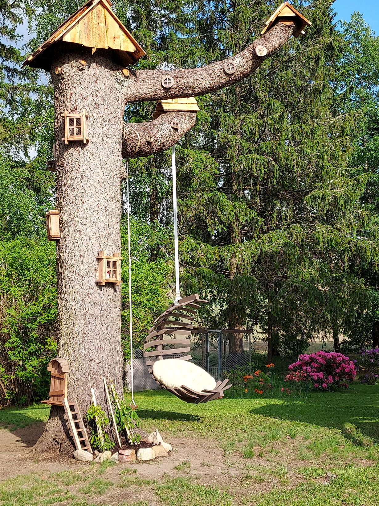 Pihan kuusivanhus oli kaadettava ja siitĂ€ tulikin Satupuu! Ja puuhun tarvittiin tietysti Valaanranka riippukeinu! đ„°