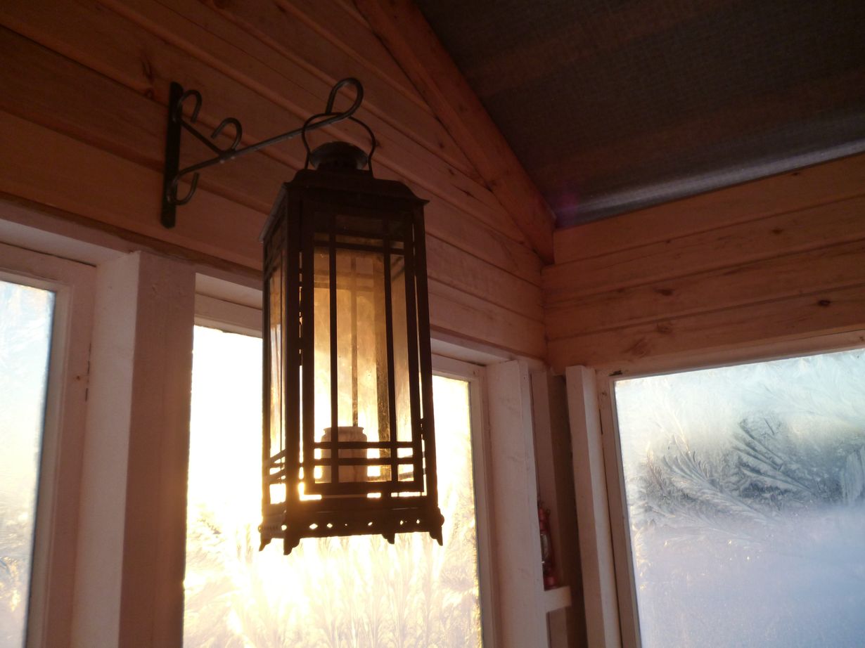 Saunomme paljon ulkosunassa kynttelöiden valossa.tämä terassin lyhty sytytetään aina ensin kun ryhdymme lämmittämään saunaa.Jääkukat koristavat lasitusta.Upea paikka rentoutua!