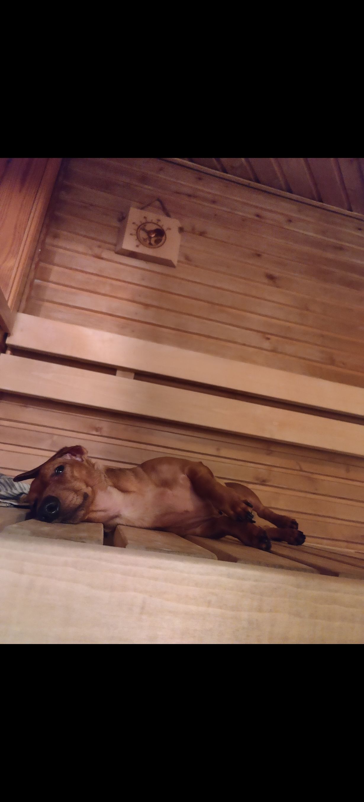 Tämä on arjen kohokohta pienelle nakki- mäyräkoiralle. Nakilla on oma laudeliina alimmalla lauteella, ja siinä hän saunoo muiden kanssa, kunnes muut lähtee ja hän valloittaa ylälauteet jälkilöylyjen ajaksi.