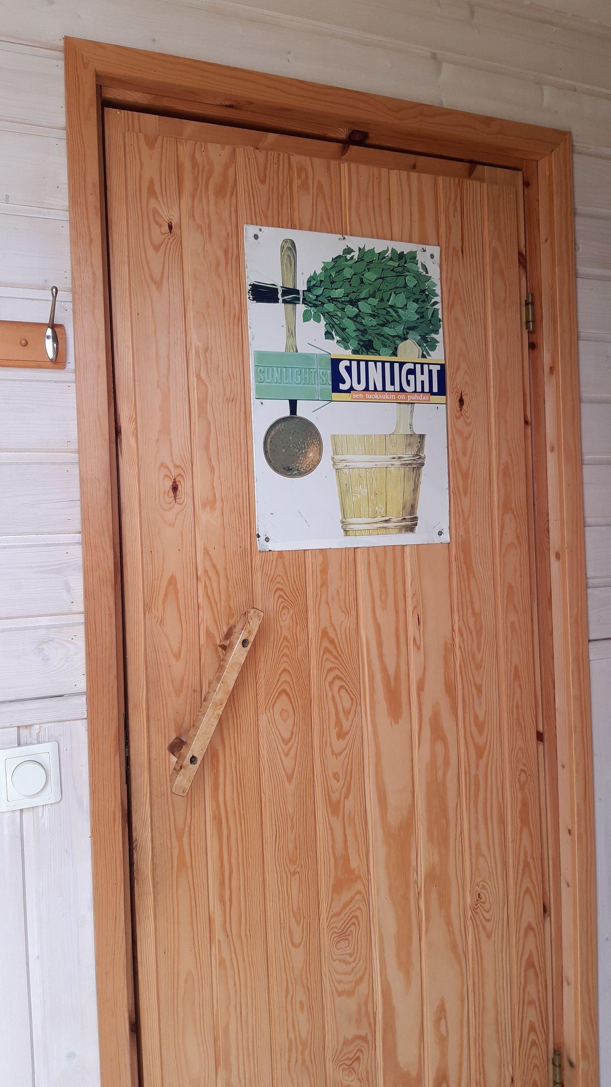 Peltinen saippuamainos mökin saunan ovessa on muisto pappani kauppiasajoista. Mökkirempassa se ja isäni aikanaan nikkaroimat oven kahvat piti ehdottomasti laittaa myös uuteen oveen.