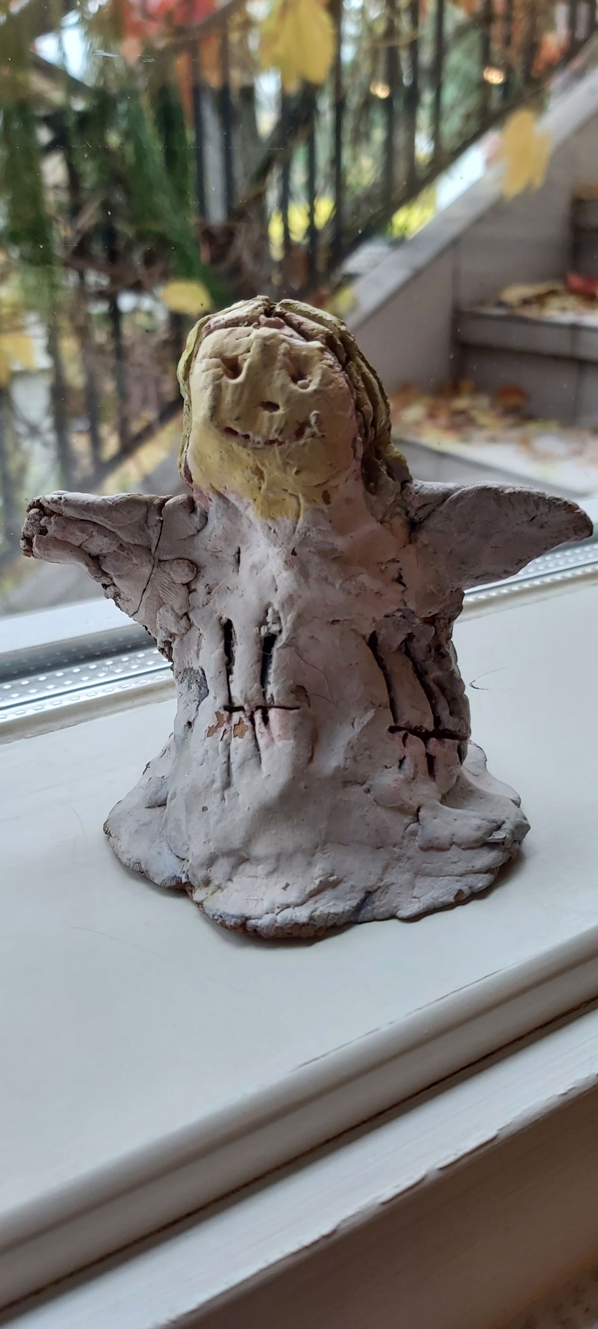 Tyttäreni tekemä kamalan kaunis savienkeli on 25 vuotta pitänyt paikkansa kodin virallisena joulukoristeena. Rakkaudella tehty, annettu ja saatu.