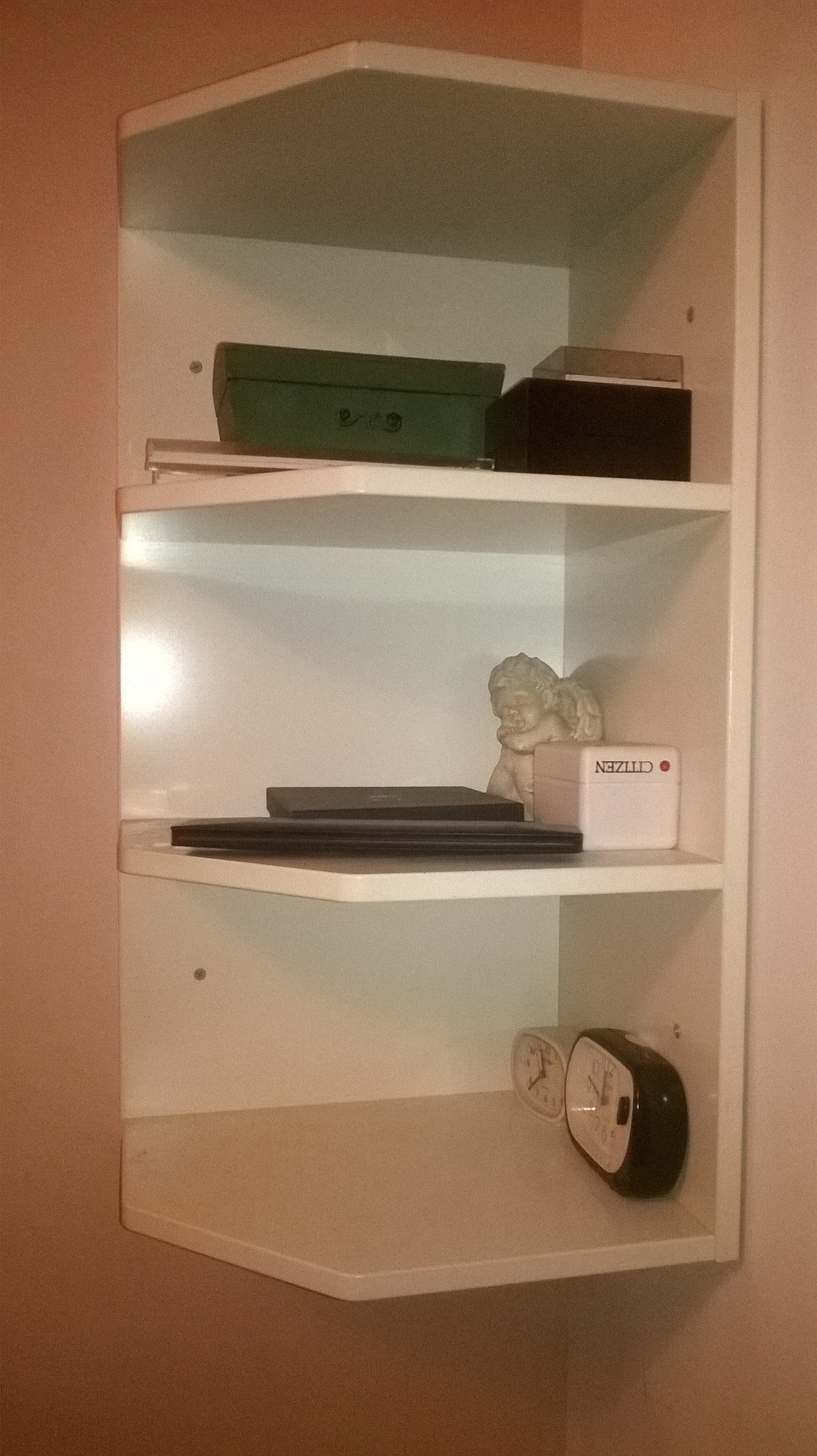 Makuuhuoneen nurkassa oleva hylly on joku huonekaluliikkeen poistohyllystä ostettu, varmaankin keittiökaapiston nurkkahylly. Se on ollut paikallaan jo vuosikausia. Laitan nukkumaan mennessä silmälasit hyllylle, mutta kännykän laitan alla olevalle yöpöydälle, jossa myös kelloradio.