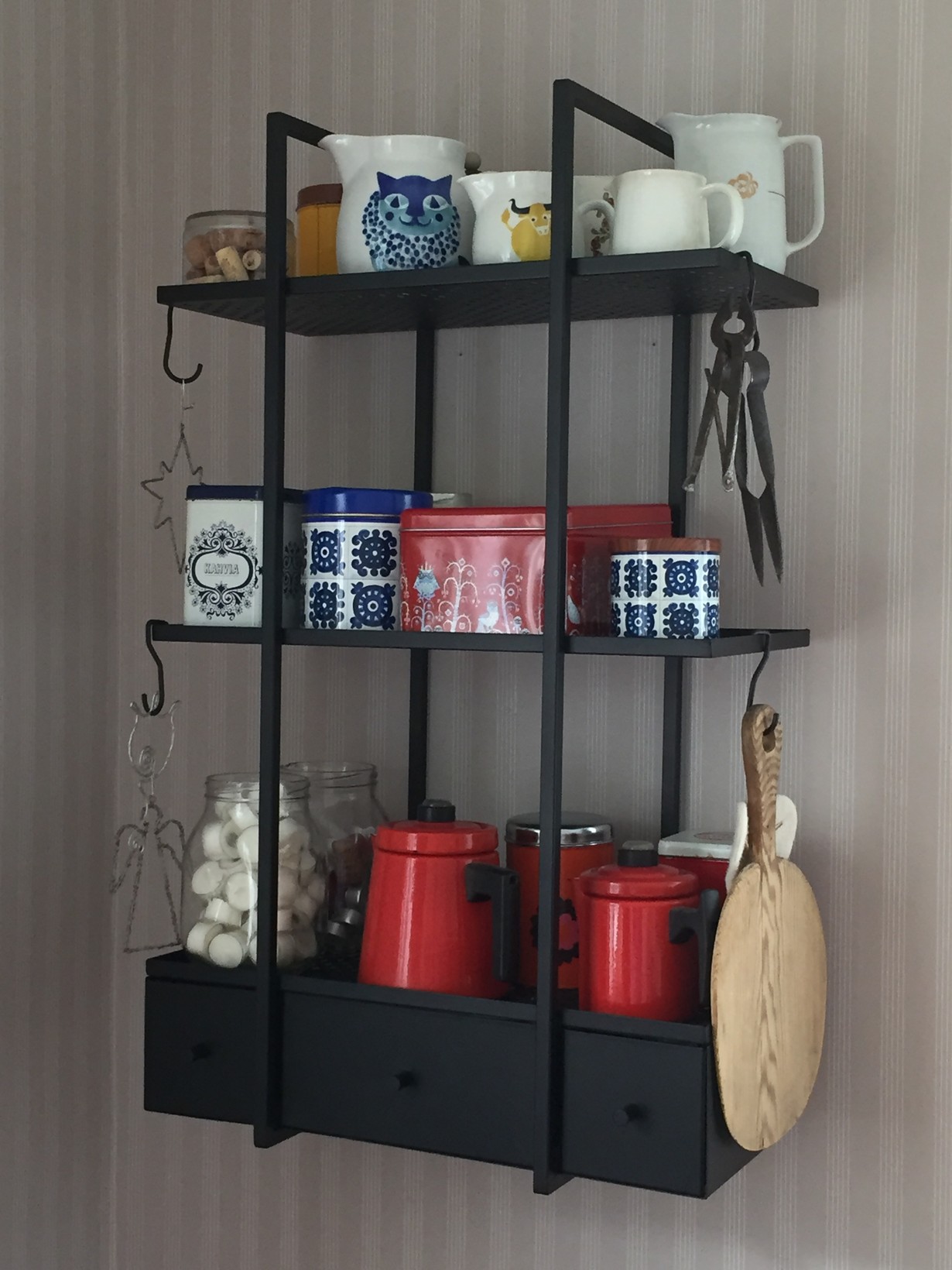 Keräilen vanhaa tavaraa, hankin niille mukavan seinähyllyn Ikeasta! Rakkaimmat esineet hyllyssä on, mumman vanha kissakannu ja äidiltä saatu leipälapio!