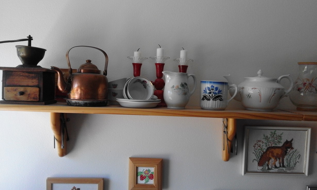 Lapsuuskodin muistoja. Puinen punainen kynttelikkö koristi joulupöytää ja pikkutyttönä jauhoin kahvipapuja hyllyllä olevalla myllyllä.