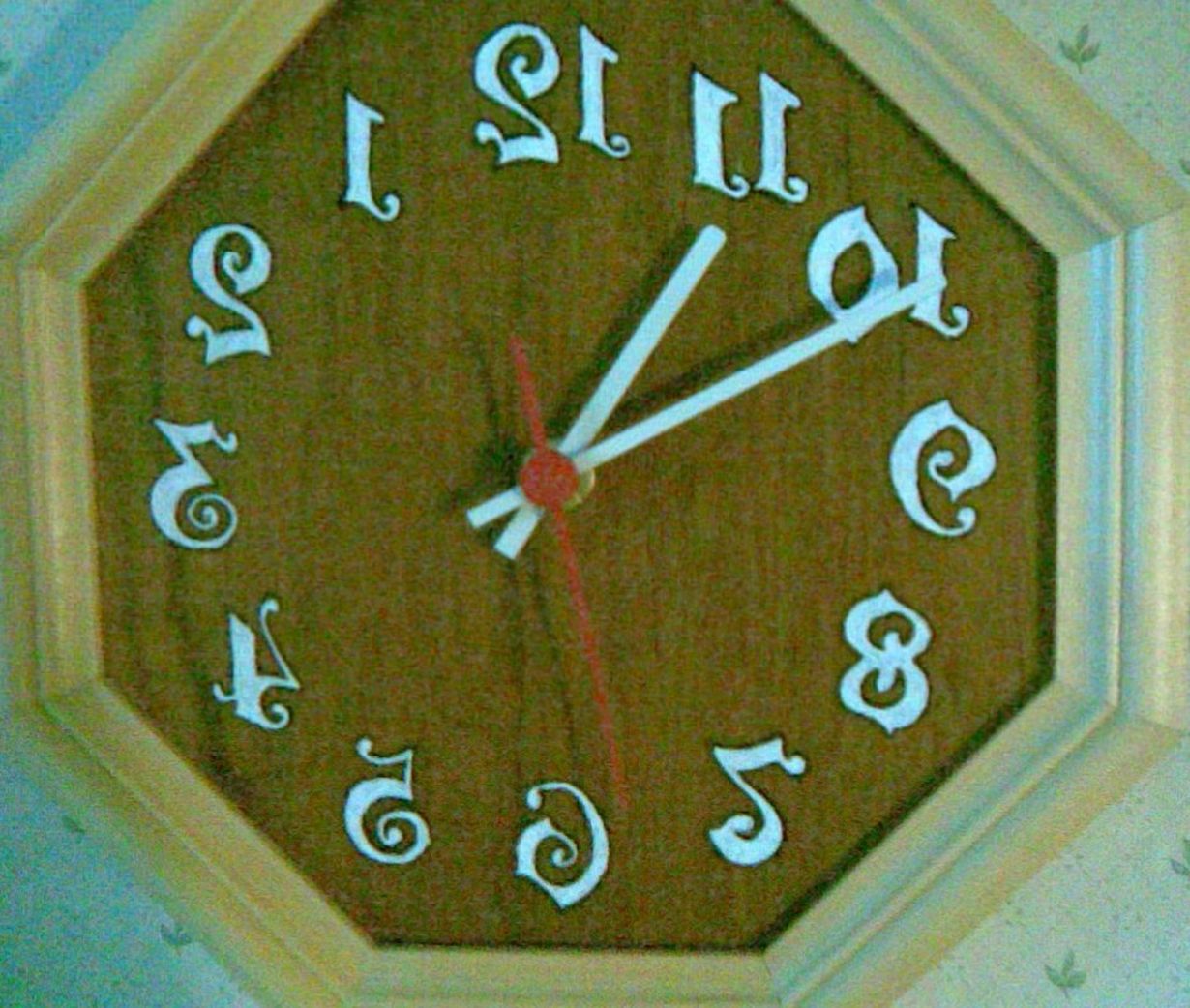 Sain seinäkellon 70-vuotislahjaksi, se on ystäväni itse tekemä. Joskus meinaavat eläkeläisenkin päivät olla kiireisiä, mutta tämä seinäkelloni pitää minut aina oikeassa ajassa, eikä tule turhia hötkyiltyä. Eikä aina niin tarvitse tietääkään just tarkkaa aikaa:-) Peilin kautta säädän viisarit kohdilleen!