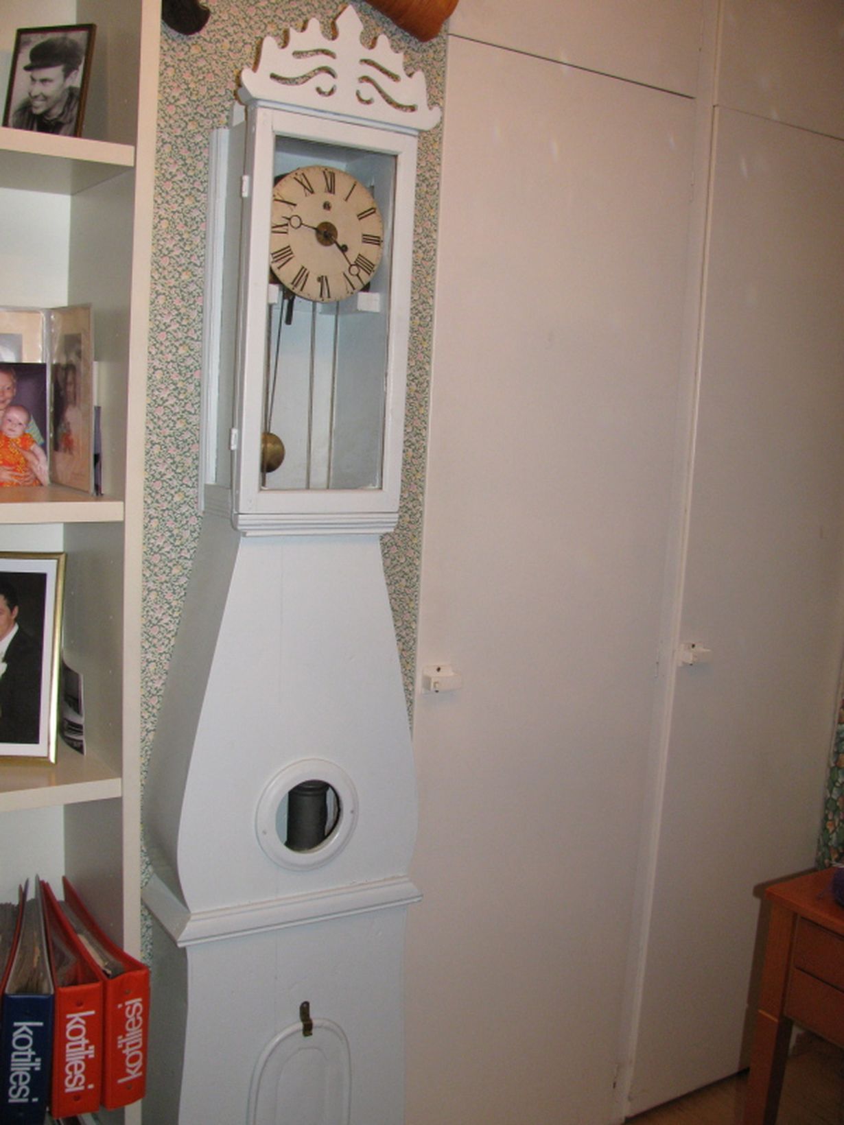Tämän kellon on valmistanut isoisäni tuossa 1800-luvun lopussa tai aivan 1900 luvun alussa.Kellossa on herätyskello toiminto , tämä kello on tehty herättämään lapsi/lapset ja tietysti äiti , silloin aina lapsi nostettiin potalle pissaamaan. Tällä konstin opetettiin lasta kuivaksi . Isäni, joka oli syntynyt 1902 sanoikin tätä kelloa leikkisästi "kusikelloksi", Myöhemmin minun ollessani9 lapsi tämä kello oli rakkaan mummuni kamarissa. Mummun kuoltua, pyynnöstäni minä sitten sain tämän omakseni.
