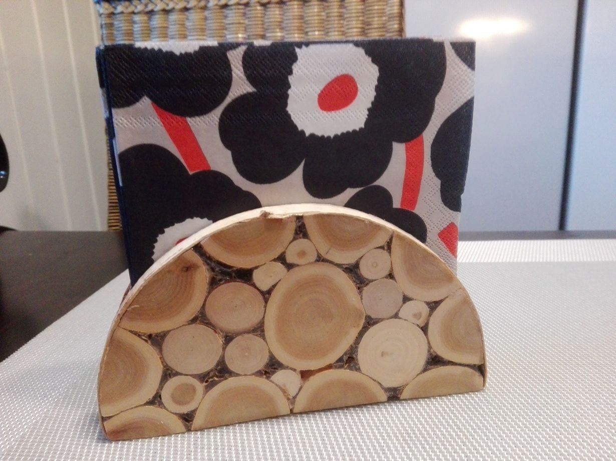Tämä on muisto isästä, hän oli ahkera askartelia puukiekoista. Hän valmisti niistä monenlaisia esineitä. Tämä ja kattilan aluset ovat käytössä joka päivä.