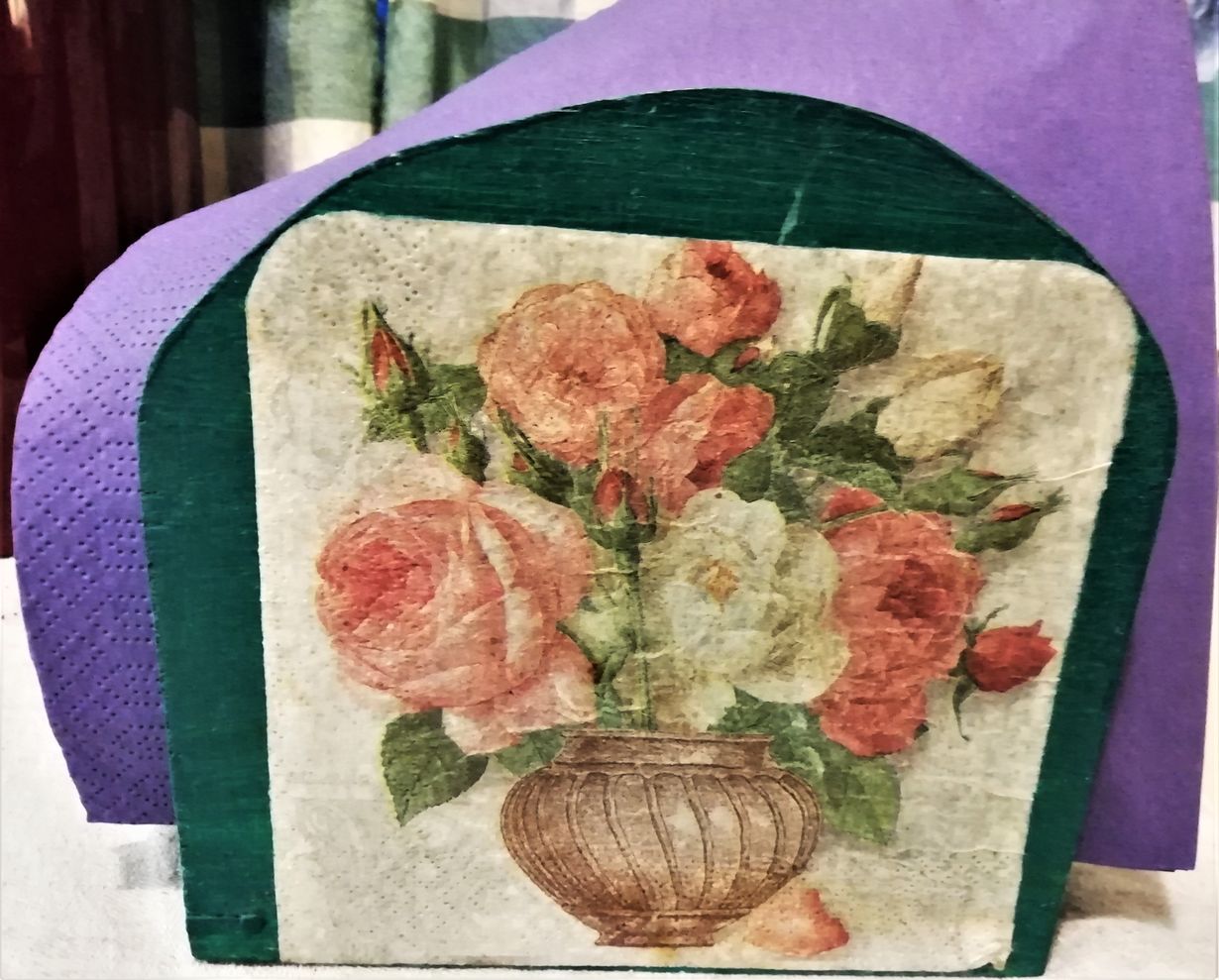 Nyt jo aikuinen tyttäreni teki tämän serviettitelineen 3. luokalla koulun puutöissä. Telineseen on decoupage -tekniikalla tehty lautasliinasta kuvat molemmin puolin. Teline on edelleen keittiössämme päivittäisessä käytössä.