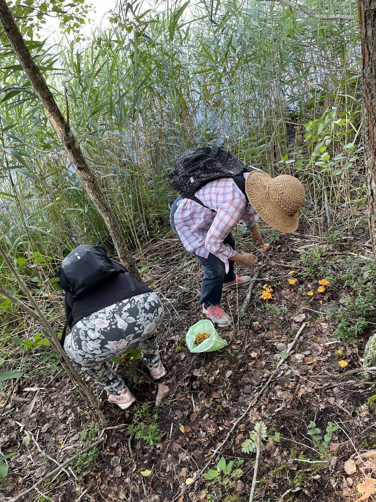 Vaellusretki Nuuksion kansallispuistossa. Metsän ”kultaa” ei voinut jättää. Sienikoriksi repusta löytyi apteekin pikkupussi, joka täyttyi lähes piripintaan. Reissu muuttui yllättäen seikkailuksi maaston muuttuessa kiipeilyä vaativaksi. Me 64-76- vuotiaat ja sienipussikin selvittiin. Illalla nautittiin kanttarellimuhennoksesta.