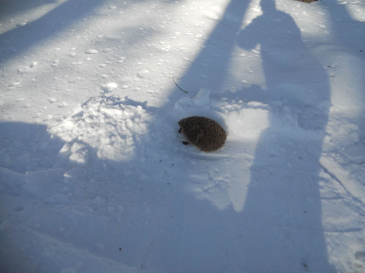 siili jo lähtenyt lumilla liikenteeseen,sai ruokaa ja vietiin lämpimään