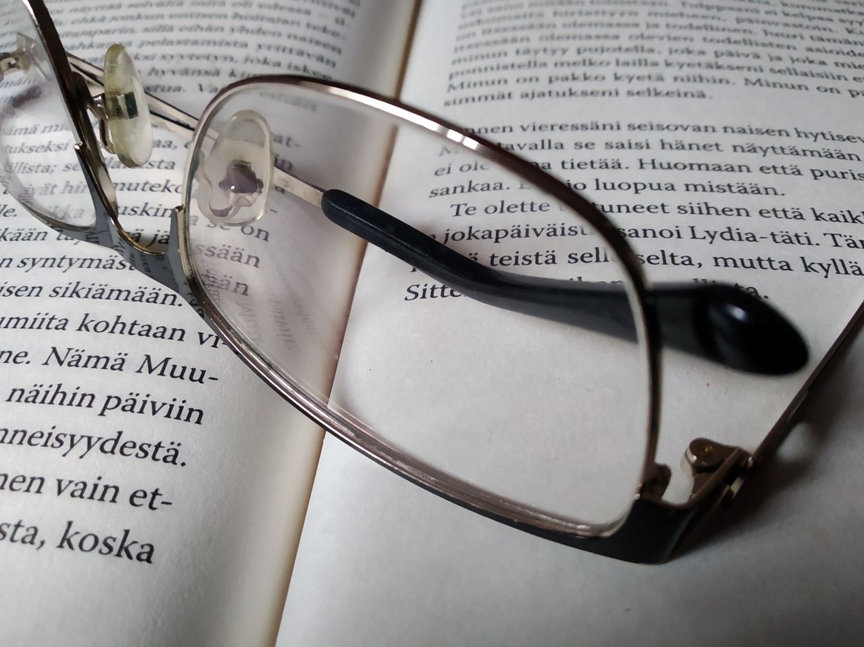Tykkään lukea kirjaa nukkumaan mentäessä. Ja kuten edellis iltana ,nappasin kirjan kainaloon ja suuntasin sänkyyn,mutta yllätys oli mitä hirvein, en nähnyt lukea tekstiä. Pakko oli suunnata optikolle ja hankkia moniteholasit.
