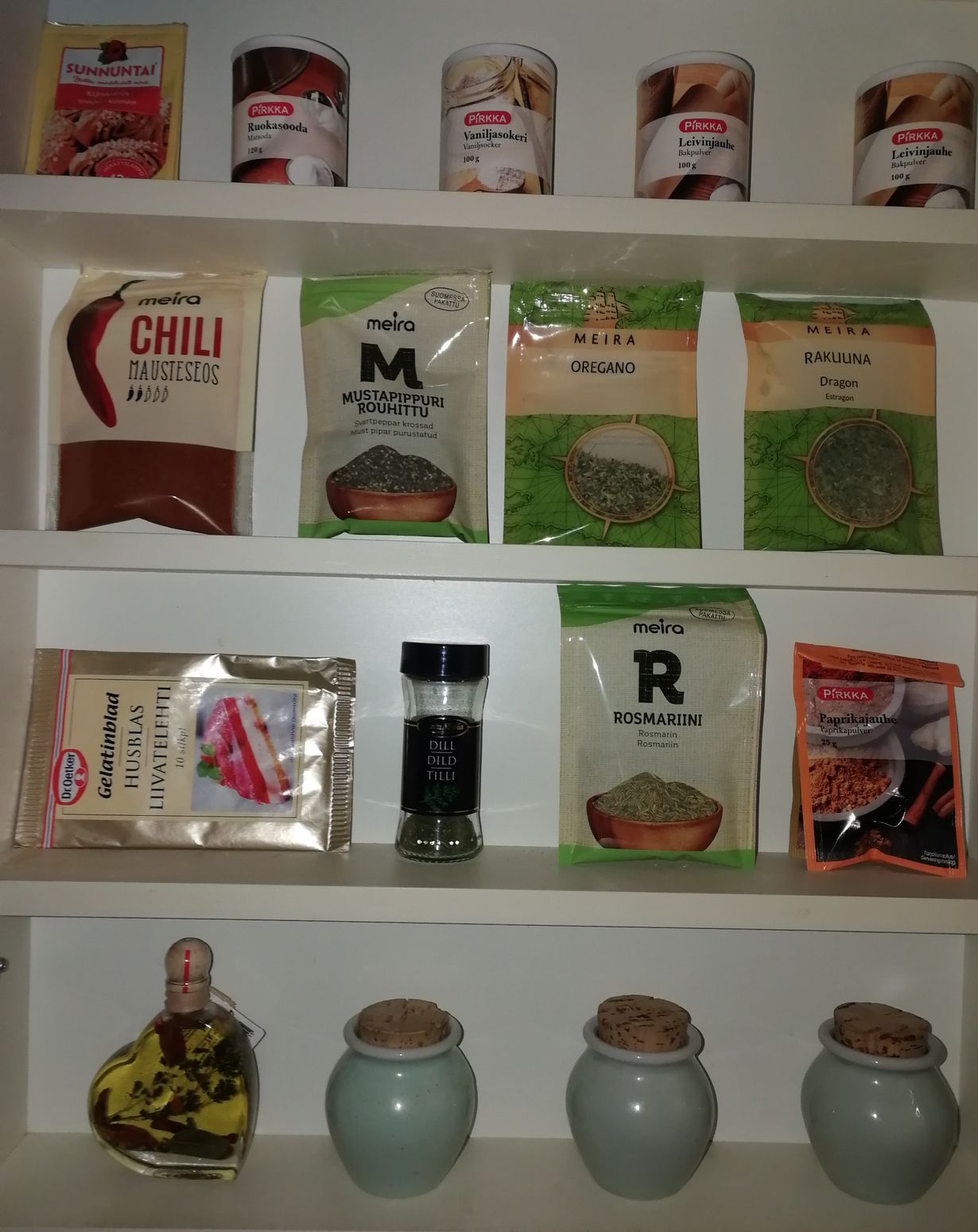 Mausteet näppärästi ja selkeästi. Öljy on ulkomaantuliainen ja alahyllyn söpöt pikkupurnukat ovat Pentikin kirpparilöytöjä joihin ihastuin heti. Purnukat sisältävät himalajansuolaa, karkeaa merisuolaa ja tavallista suolaa.