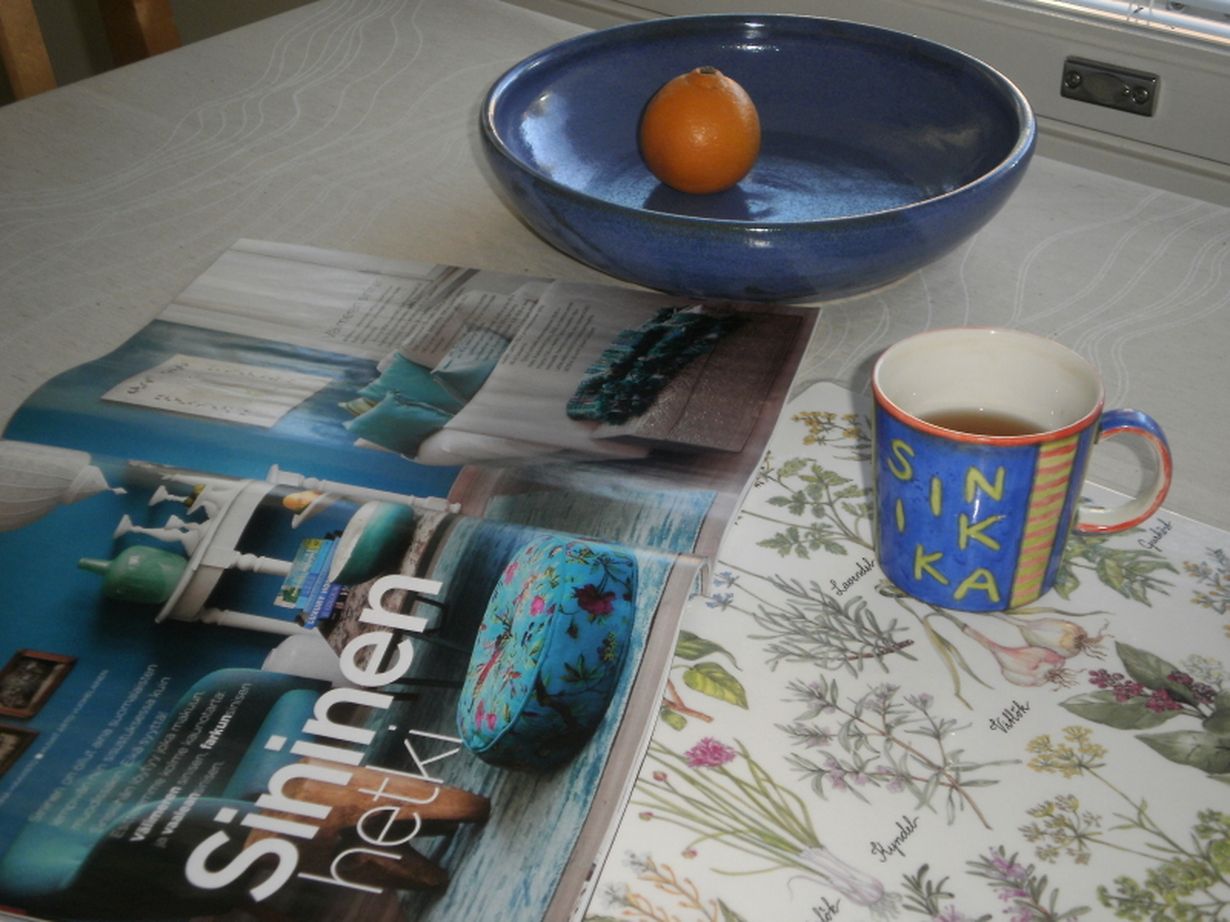 Lempivärejäni ovat sininen ja oranssi, joten mukia on kiva katsella ja tietty se tuo usein mieleen mukavat teetauot Järvenpään kirjastossa.