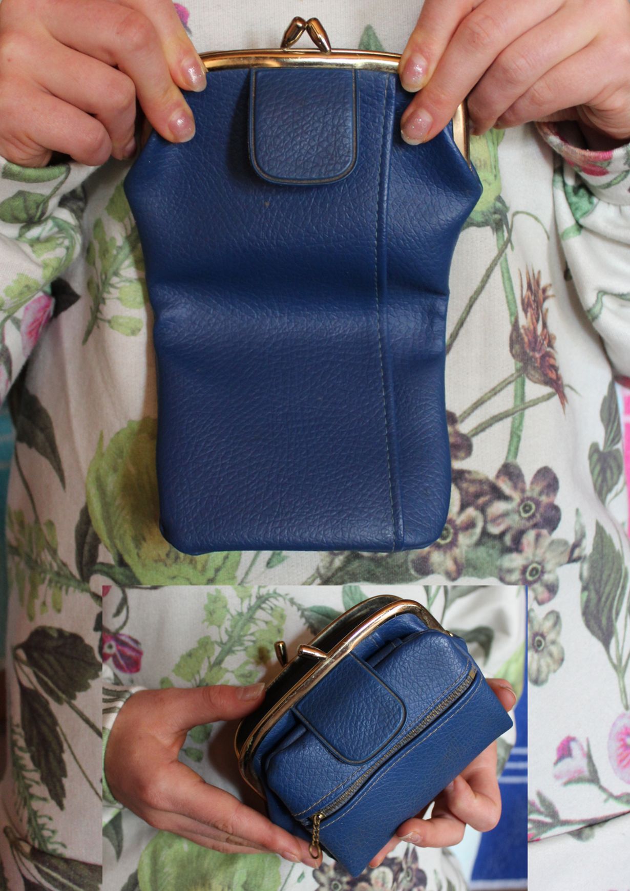 Pelastin tämän hylätyn aarteen mummulan autotallin perukoilta. Sähkönsiniseen hauskasti taittuvaan kukkaroon mahtuukin sekä kolikot, setelit että kortit!