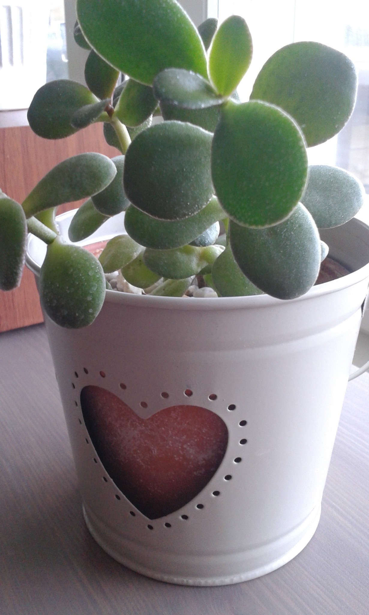 Jokseenkin tavanomainen peltinen, sydämenmuotoisella aukolla varustettu kukkaruukku ja sisällä saviruukussa sinnikäs rahapuu. Alunperin monta vuotta sitten tämä rahapuu oli valtavan kokoinen ja voi hyvin. Sitten se alkoi kuihtua ja jäljelle jäi vain muutama lehti. Sinnikkäästi pari lehteä säilyi vuosien ajan, muutoista huolimatta. Lopulta vaihdoin sille uudessa kodissa uuden mullan, ruukun ja se asettui lopulta valoisalle olohuoneen ikkunalle. Vuoden jälkeen se on alkanut vihdoinkin kasvaa! Ehkä siitä vielä kasvaa uudelleen se valtavan kokoinen rahapuu!