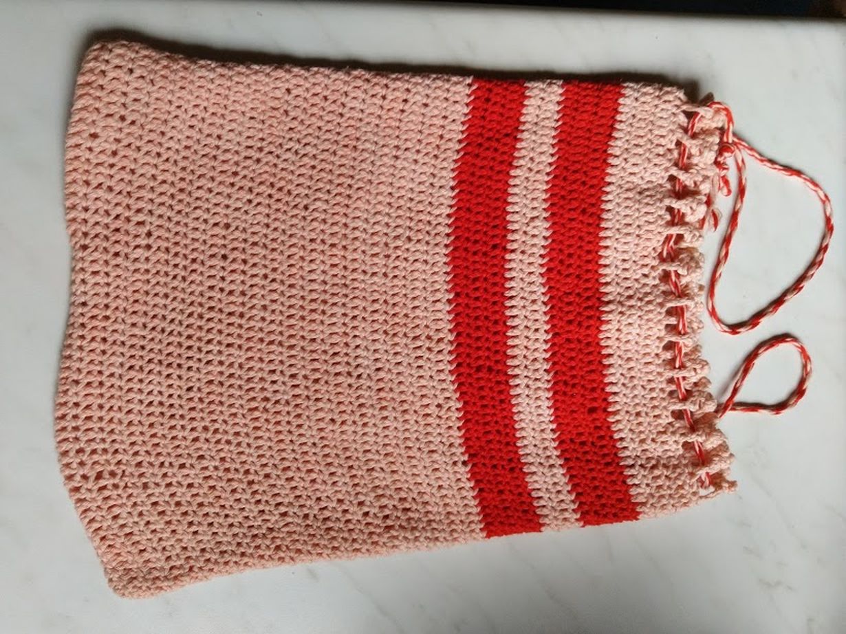 Virkkasin tämä ollessani v. 1964 kansakoulun 4. luokalla. Vein kotiin äidille, mutta äidin kuoltua löysin pussukan käyttämättömänä hänen jäämistöstään. Nykyään sipulipussi on omassa taloudessamme käytössä.