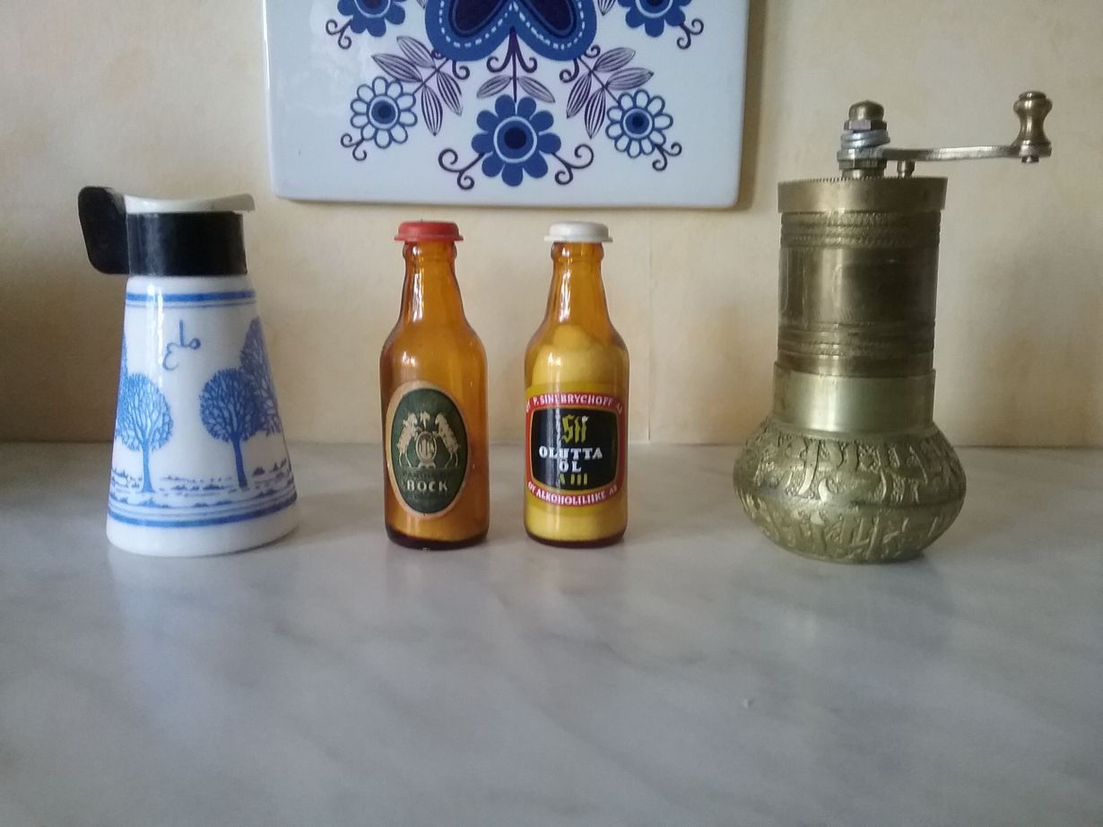 Olutpullosirottimet vanhempieni mökiltä, vasen SaudiArabiasta, oikea Turkista. 60-70-luvulla mökillä oli mäyräkoiranmallinen, suusta suolaa ja peräpäästä pippuria, ilmeisesti särkynyt, harmi!