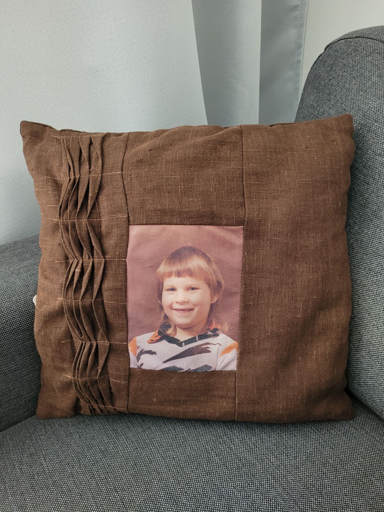 Kymmenen vuotta sitten 40 täytettyäni lapsuudenystäväni halusi lainata minusta valokuvaa lapsena. Sain lahjaksi aivan ihanan itsetehdyn tyynyn jossa on esikoulukuvani.