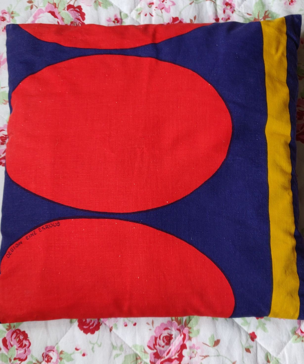 Löysin tämän sisustustyynyn kauan sitten roskalavalta. Se on niin ihanan ruma, että ihastuin siihen oitis. Design Eine Ekroos - nimi ei sano minulle mitään.