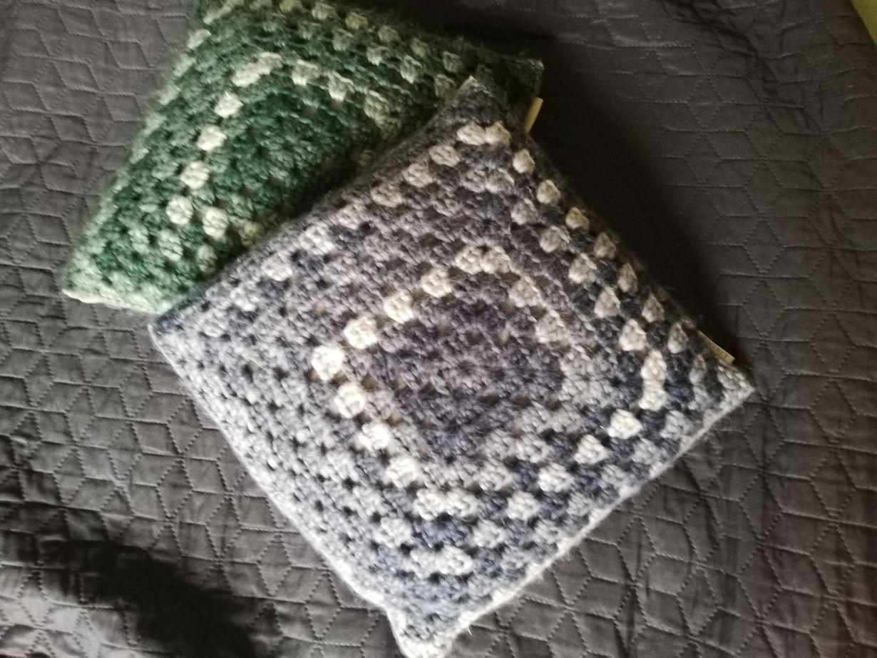 Ostin uuden päiväpeiton. Ystäväni kävi kahvilla ja samalla ihasteli ostostani. Seuraavan kerran hänen tullessa mukana olivat nämä kaksi tyynyä jotka hän oli tehnyt minulle. Sopivat hienosti uuteen päiväpeittooni.