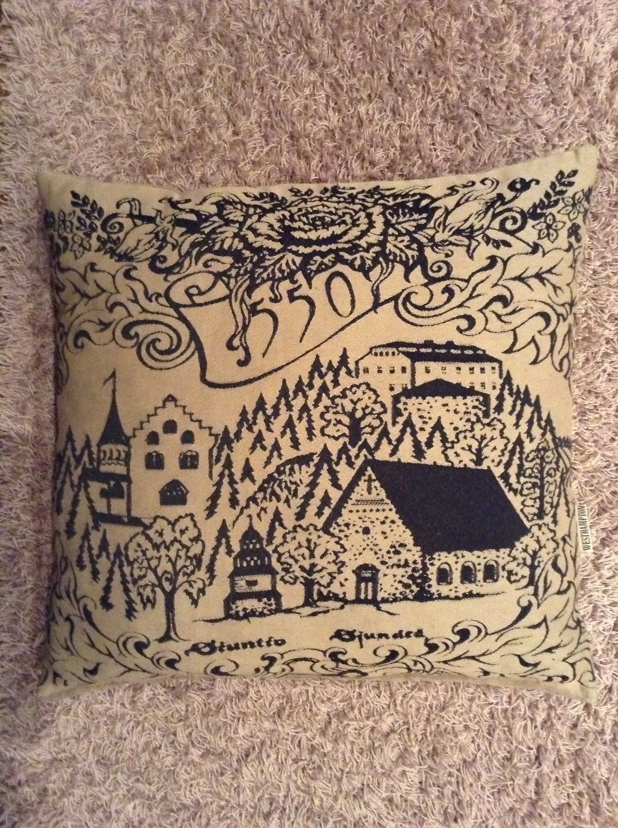 Kälyni upea taidonnäyte, juhlavuoden kunniaksi suunnittelema ja ompelematyyny joka on meille rakas ja sopii loistavasti kotimme väreihin!