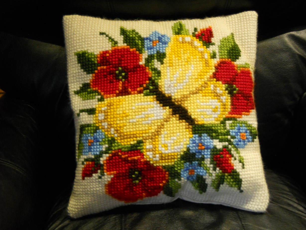 Kuvaa sohvatyynysi! Voit voittaa Nespresso-kahvikoneen sohvatyyny kilpailu Ämmy 17.7.2016 klo 16:23 Olen tehnyt tämän tyynyn ristipistotyönä. Tykkään perhosista ja tämä perhonen koristaa kotiamme talvellakin.