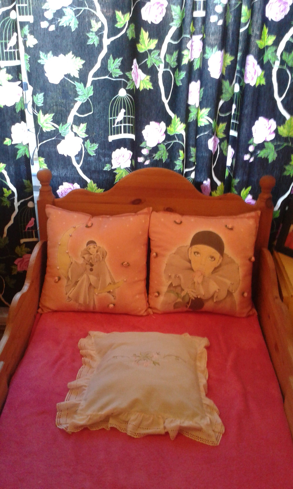 Olen muutama vuosi sitten tehnyt hoitolapsilleni prinsessahuoneen .Nyt ,kun olen eläkkeellä se on edelleen samassa asussa ja toimii vierashuoneena .Nuorin tyttäremme teki kerran äitienpäivälahjaksi nämä ihanat tyynyt <3 Siellä ne nyt koristavat prinsessahuoneen pikkusänkyä <3