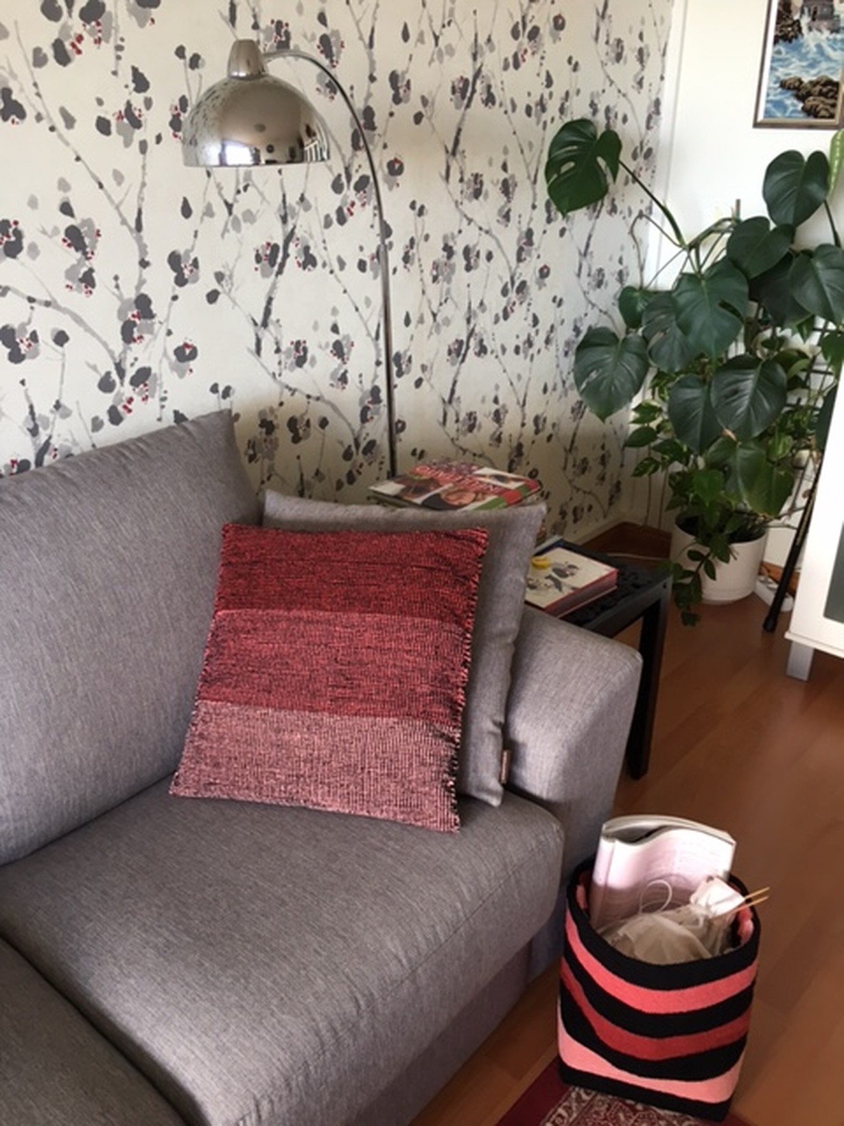 Olin muutama vuosi sitten työväenopiston kudontakurssilla. Siellä syntyi kangaspuissa maton ja sisustuskorin lisäksi tämä poppanasohvatyyny.