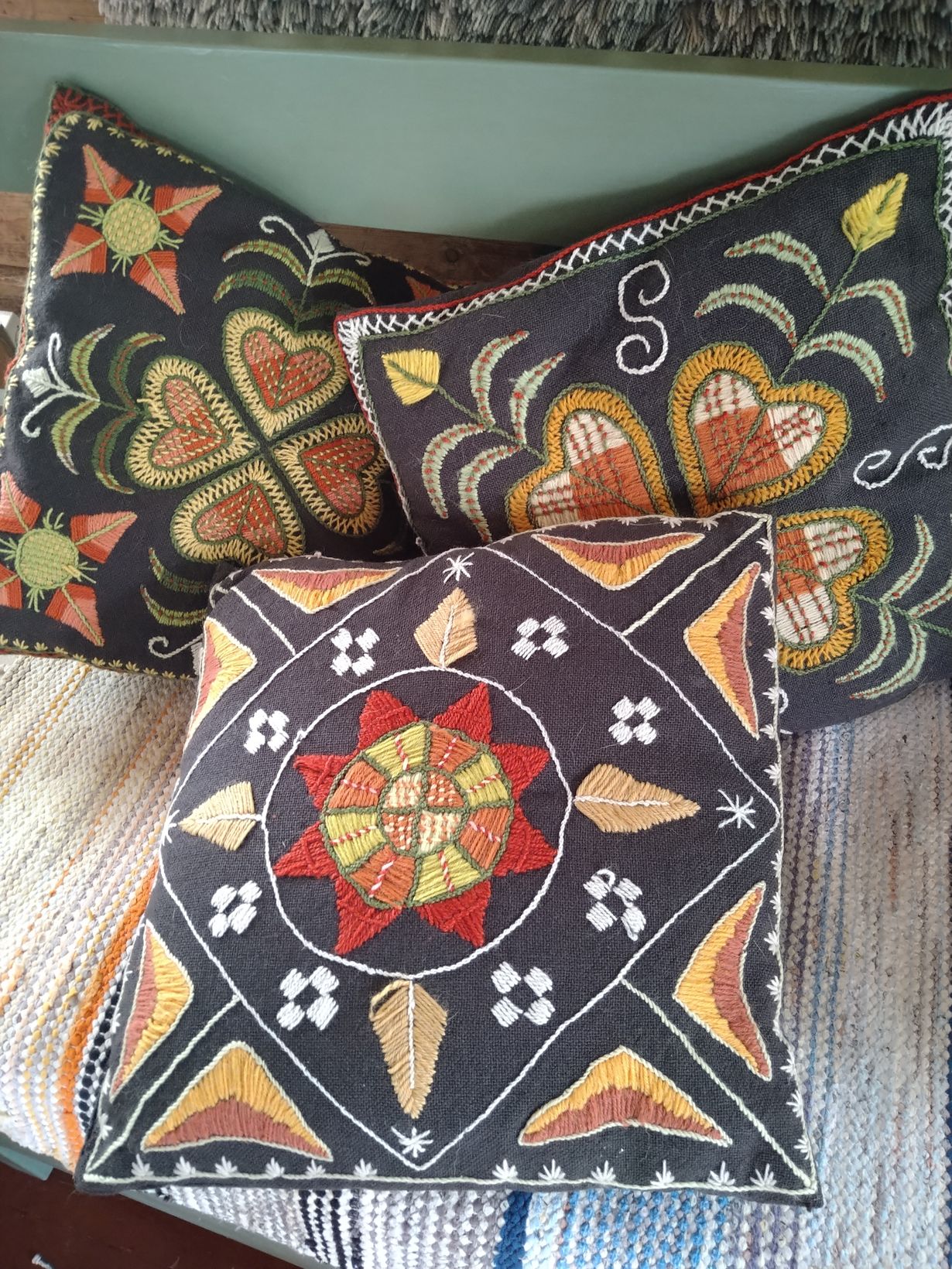 Nämä tyynyt on tehty 80- luvulla kansalaisopiston kirjontapiirissä. Minä ohjasin opiskelijoita, joista yksi oli äitini. Äidin kirjomia on kaksi, minun yksi. Aarteita ovat!