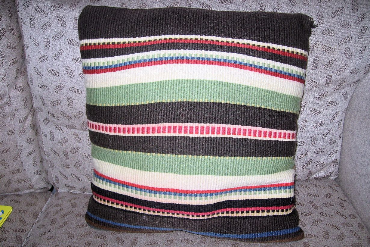 Tämän sohvatyynyn on kutonut anoppini joskus yli 40 vuotta sitten, ja mieheni on muka osallistunut sen kutomiseen... Se on nyt meidän kodissamme nykyisellä sohvalla.
