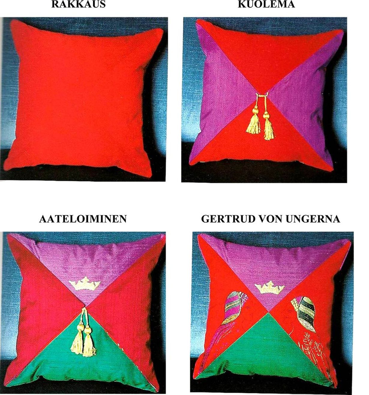 Kuvia on siksi näin paljon, koska tyynyllä on neljä eri ilmettä. Se on päivittäisessä käytössä, ollut jo vuodesta 1994 lähtien, jolloin kirjani Muistojen keko tuli valmiiksi.