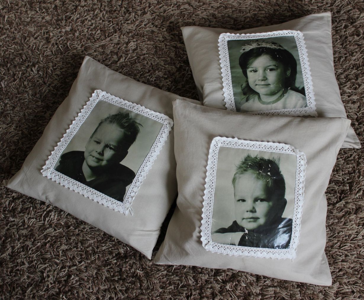 Sain tyynyt äitienpäivälahjaksi lapsiltani. Tyynyissä kuvat lastenlapsistani.