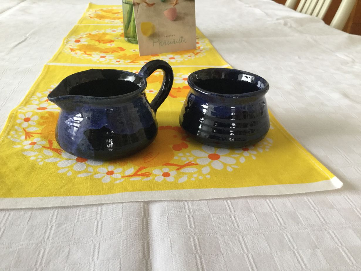 Kesällä 1973 nuorena kihlaparina kävimme Valamoon luostarissa ja olisimme halunneet yöpyä siellä, mutta meitä ei olisi majoitettu samaan huoneeseen, kun emme olleet naimisissa. Ostimme nämä sokeri-ja kerma-astiat muistoksi ja jatkoimme matkaa.