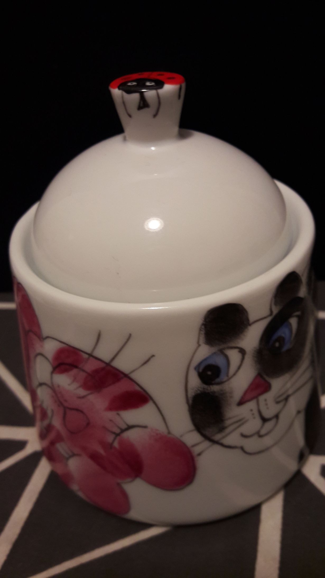 Olen ostanut Tallinnan matkoilla Helinä Tilkin kissa-astioita. Sokerikko oli toinen hankintani. Välillä tarjoilen siitä palasokeria, välillä hienosokeria ja jouluna kaneli-sokeria.