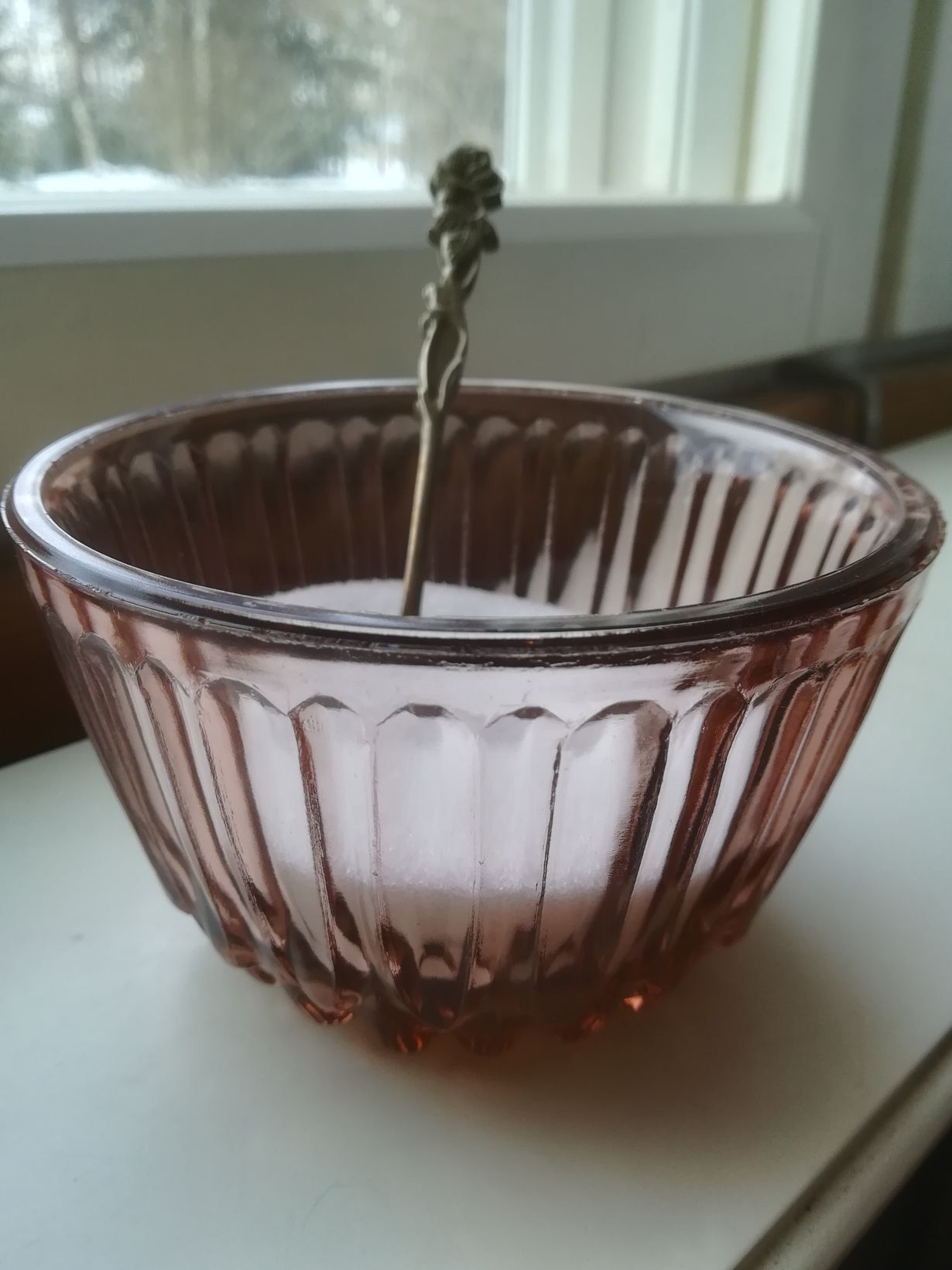 Ostin tämän vaaleanpunaisen lasikulhon muutamia vuosia sitten kirpputorilta,hinta oli alle euron. Se oikein huusi siellä hyllyssä päästä mukaan! Elämä on siihen jo jättänyt jälkiään, mutta on se vaan niin kaunis.