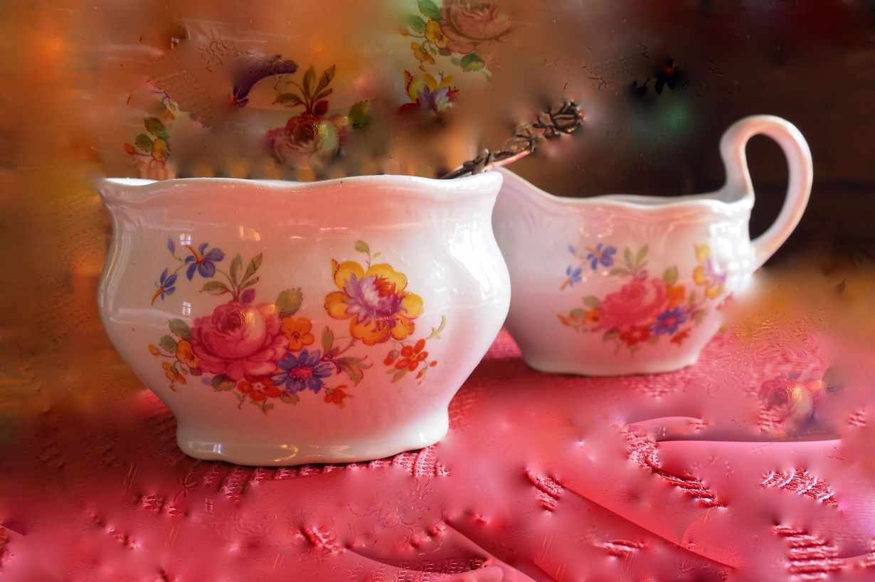 Sokeriastiani ja kermakkoni . Olen perinyt ne äidiltäni Mirjalta joka oli perinyt ne anopiltaan Josefiinalta. Astioilla on ikää jo reilut 100 vuotta koska oma ikäni on 67v. Astiat ovat suomalaista Arabian tuotantoa.