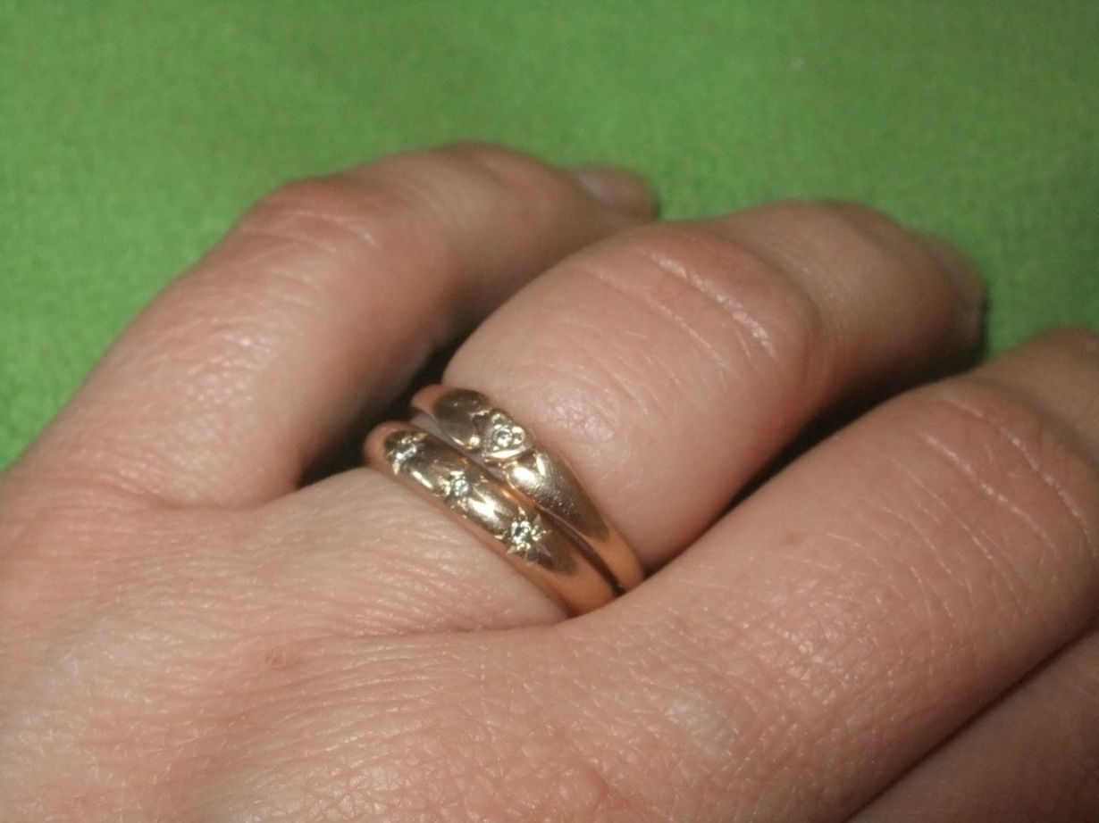 Sormukset on ostettu toisen ja neljännen lapsen synnyttyä. Kihla ja vihkisormukset eivät mahdu sormeen.