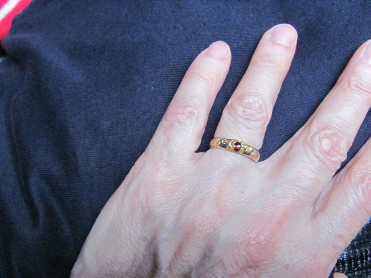 Olen 61-vuotias ja harrastanut kullankaivua lähemmäs 20 vuotta. Siihen käytän kesälomani. Tämän sormuksen teetin itse kaivamastani kullasta. Myös kivi on kultamailta kaivamani granaatti.