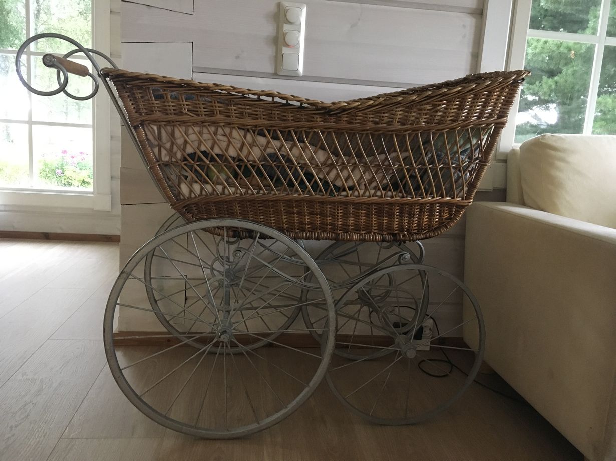 Isoisän isoisän lastenvaunut 1800-luvulta kätkevät tarvittaessa sohvalle tai sohvapöydälle jääneet käsityöt ja muun tilpehöörin tuossa tuokiossa vieraiden ollessa jo ovella.
