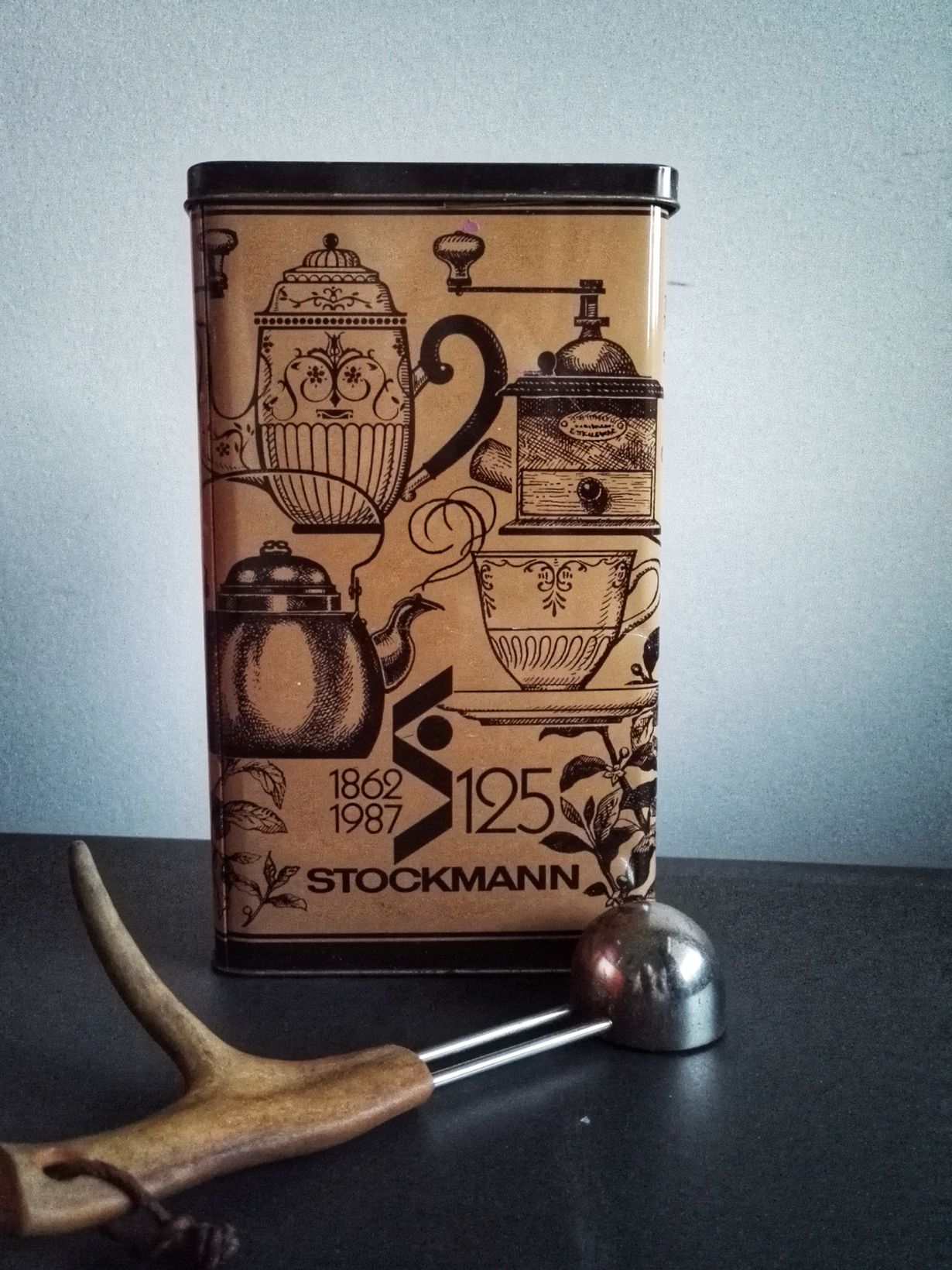 Kuten jo kuvasta näkyy, purkki on jonkinmoisen vanha. Mummolasta lienee peräisin? Olen kaunista kahvipurkkia etsinyt vuosikausia, vaan en ole löytänyt. Tä siis edelleen käytössä.