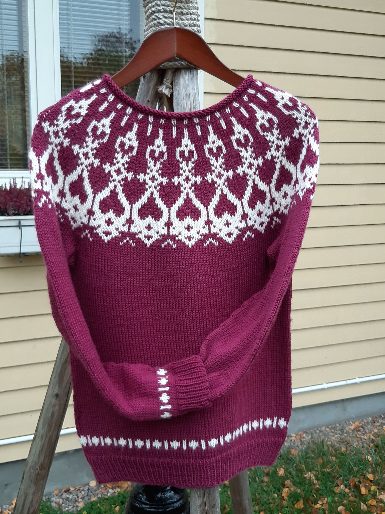 Olen jäänyt joku aika sitten eläkkeelle. Aikaisemmin en kutonut juuri mitään. Nyt kun on aikaa enemmän , olen ihan hurahtanut tähän kutomiseen. Ensin kudoin sukkia ja pipoja. Sitten innostuin kaarrokeneuleista. Kudoin joitakin puseroita ja nyt tämän kuvassa olevan neuleen miniälle syntymäpäivä lahjaksi.