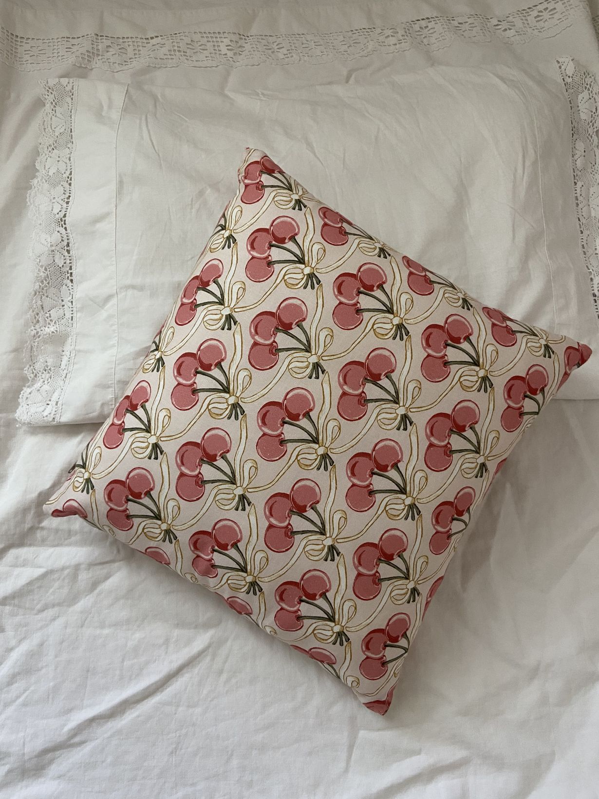Pieni tyttäreni sai tämän kirsikkakuvioisen tyynyn lahjaksi kummitädiltään. Siinä on hänen lempivärinsä ja se ilahduttaa sängyn päällä joka päivä.