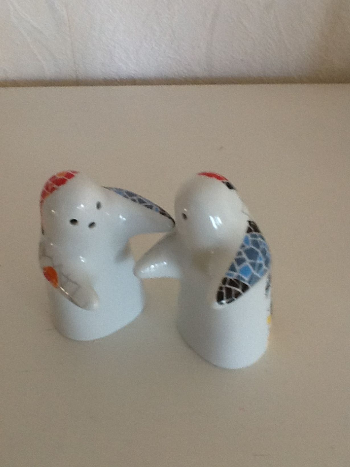 Sain nämä posliinista tehdyt sirottimet Valneciasta tuliaisena ystävältäni. Todella kauniit, värikkäät ja hyvänkokoiset. Pöydällä halaavat toisiaan, jos eivät ole "käytössä"