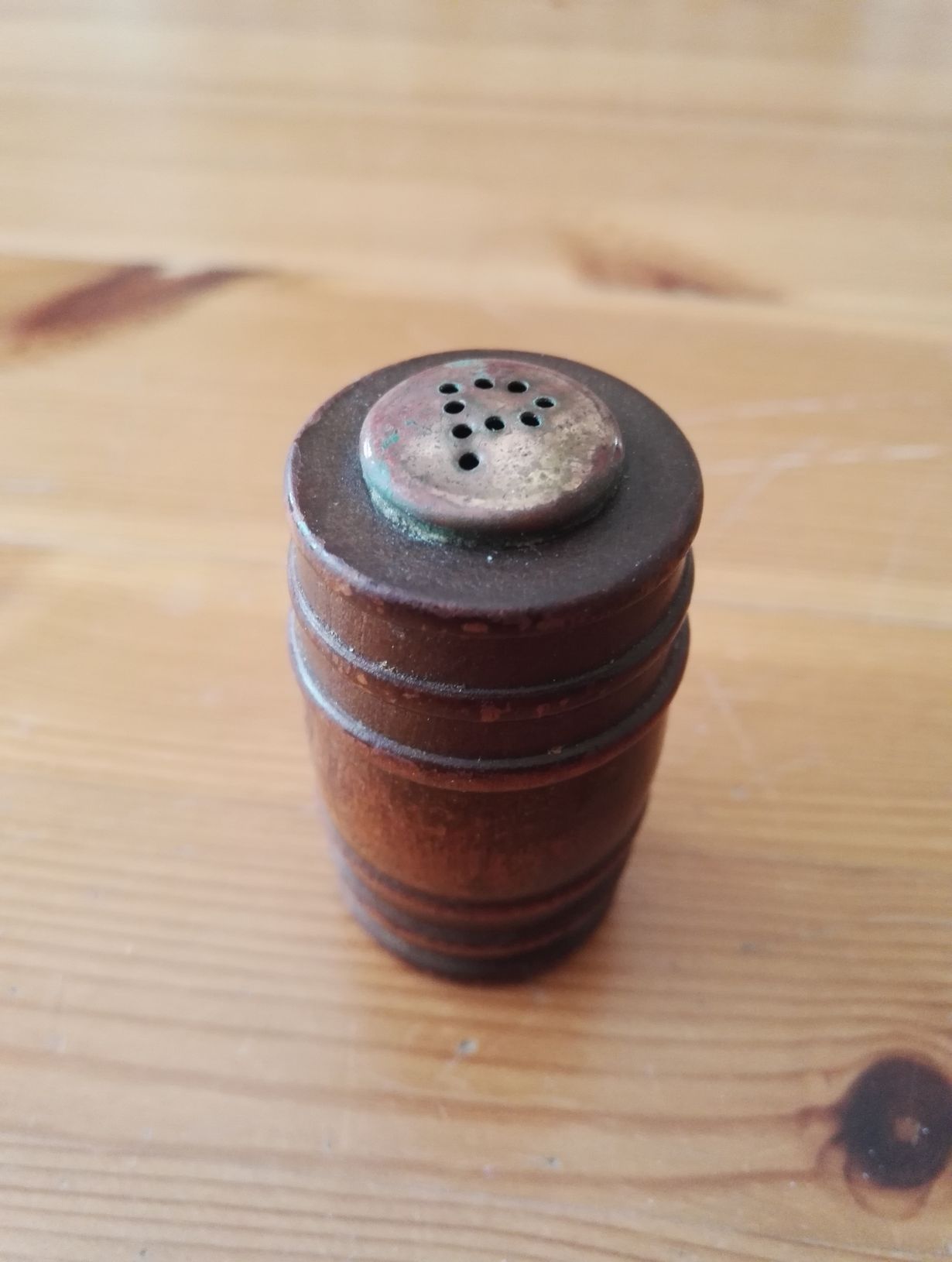 Lapsuuden kodissani käytössä ollut suolasirotin. Huomaa p niinkuin suola.