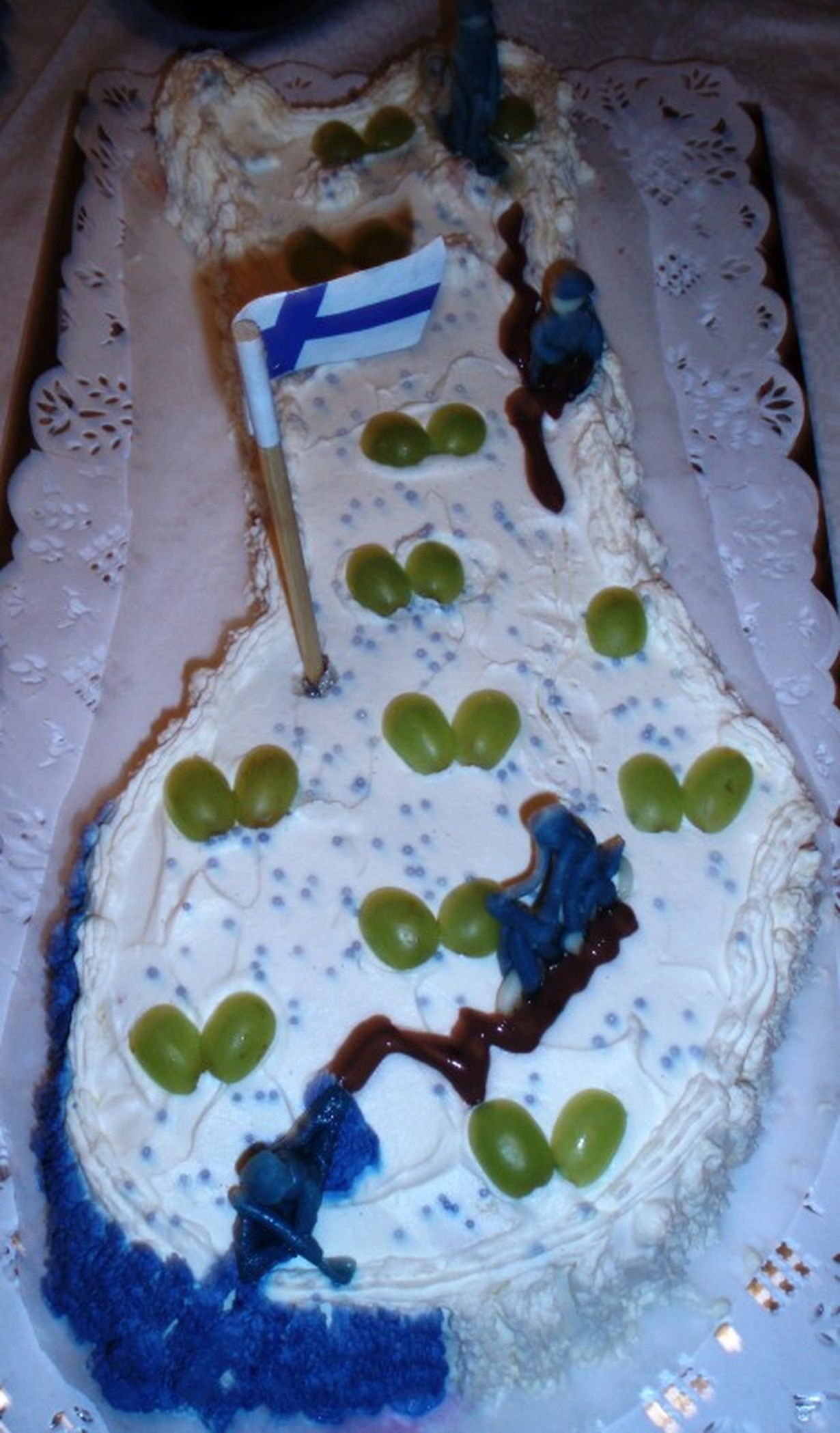 Sisareni teki tämän Suomi-kakun v. 2006. Syynä kakun tekemiseen oli se, että Tunturikerho Kavtsin SuomiPäästäPäähän -projekti,johon olin osallistunut, oli onnistuneesti saatu päätökseen. Kakun päälle muovailtiin marsipaanista koristeeksi kuvakkeet eri liikkumistavoista, joita oli käytetty Suomea päästä päähän kuljettaessa: hiihto, patikointi, pyöräily ja