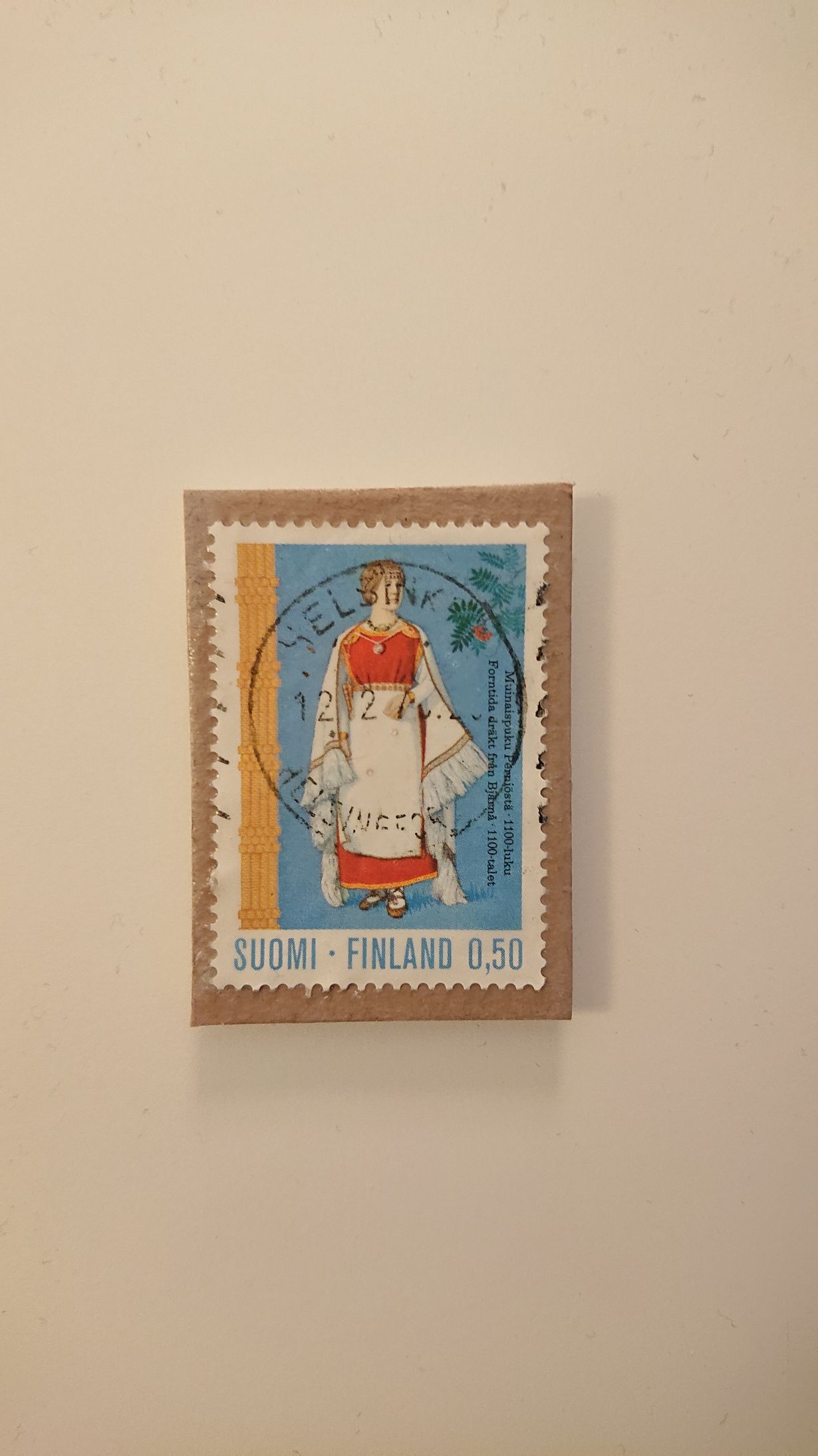 Kaunis vanhasta suomalaisesta postimerkistä tehty jääkaappimagneetti ostettu muistoksi Porvoon reissulta.