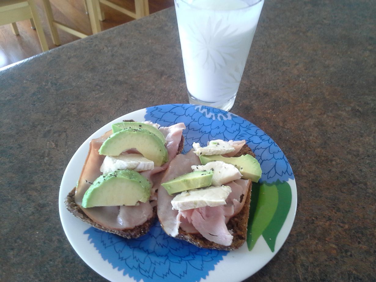 Arkilounas siellä Suomessa herkkulounas täällä rapakon takana. Oikeaa suomalaista ruisleipää paahdettuna päälle voita, kinkkua, avocadoa ja Brie juustoa. Kyytipojaksi lasi paikallista piimää joka kylla maistuu ihan suomalaiselle piimälle. Suomitytön herkkulounas nam!
