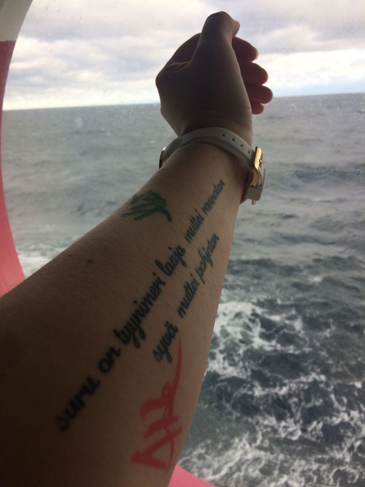 Tatuointi vanhempieni muistolle lempiyhtyeeni laulun sanoin. Molempien kuolemasta tuli tatuoinnin ottamisen aikaan vuonna 2014 parikymmentä vuotta. Aika auttaa ja suru helpottaa. Kaipaus ja rakkaus jää.